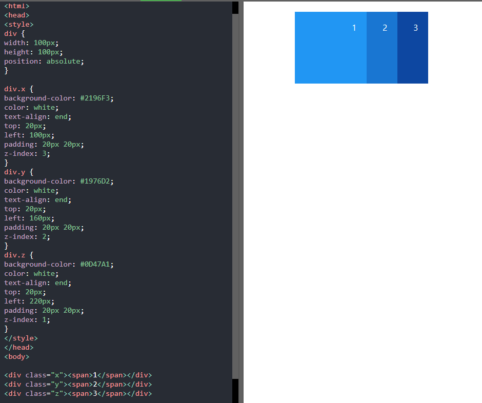 하지만 z-index를 지정해주면 자동으로 지정된 순서를 costom하게 지정할 수 있다. z-index 값이 클수록 요소가 앞으로 나온다.