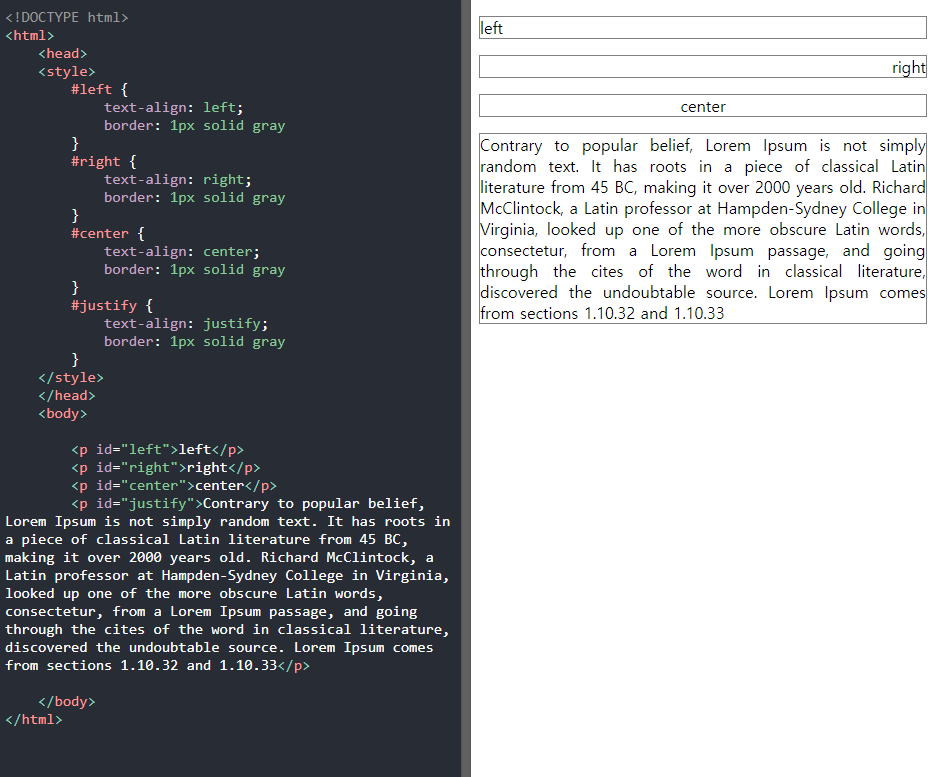 - justify : 양쪽 끝을 기준으로 균등하게 정렬